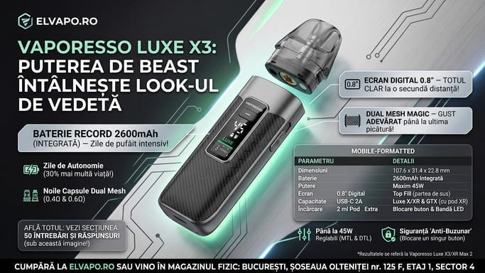 • Vaporesso Luxe X3: Putere 45W & Baterie Masivă de 2600mAh