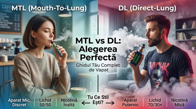 Descoperă diferențele esențiale dintre stilurile de vapat MTL (Mouth-To-Lung) și DL (Direct-Lung). Află ce aparat ți se potrivește, cum să alegi lichidul corect și cum să obții aroma perfectă fără să îți dai bugetul peste cap