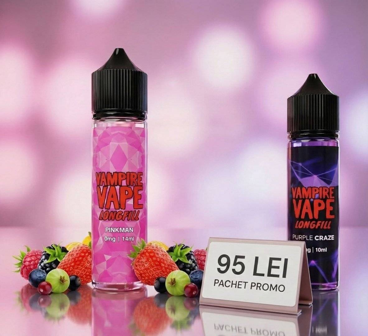 Reînnoiește-ți stocul de arome cu pachetul nostru special, dedicat fanilor calității britanice. La prețul de 95 Lei, primești două dintre cele mai apreciate lichide Longfill de la Vampire Vape, oferindu-ți atât o explozie de fructe, cât și un mix fresh legendar.