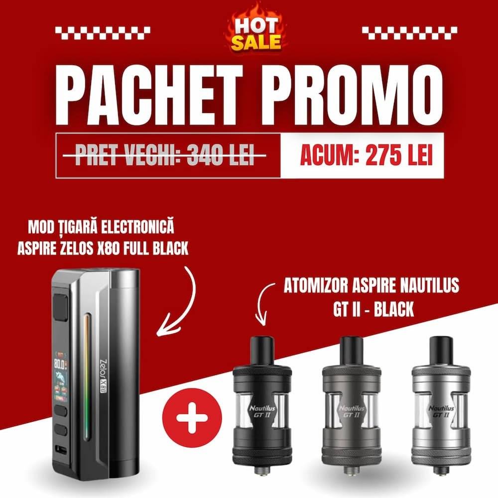 Pachetul Promo Aspire Zelos X80 Full Black + Aspire Nautilus GT II Black este combinația potrivită pentru cei care vor un setup stabil, elegant și ușor de configurat, cu accent pe aromă și control. Ai un mod precis, cu putere suficientă pentru majoritatea stilurilor de vapat, plus un atomizor din seria Nautilus, recunoscut pentru tirajul MTL și pentru versatilitatea setărilor de airflow. În plus, fiind pachet promo, obții cele două componente împreună, la un raport mai bun decât achiziția separată.